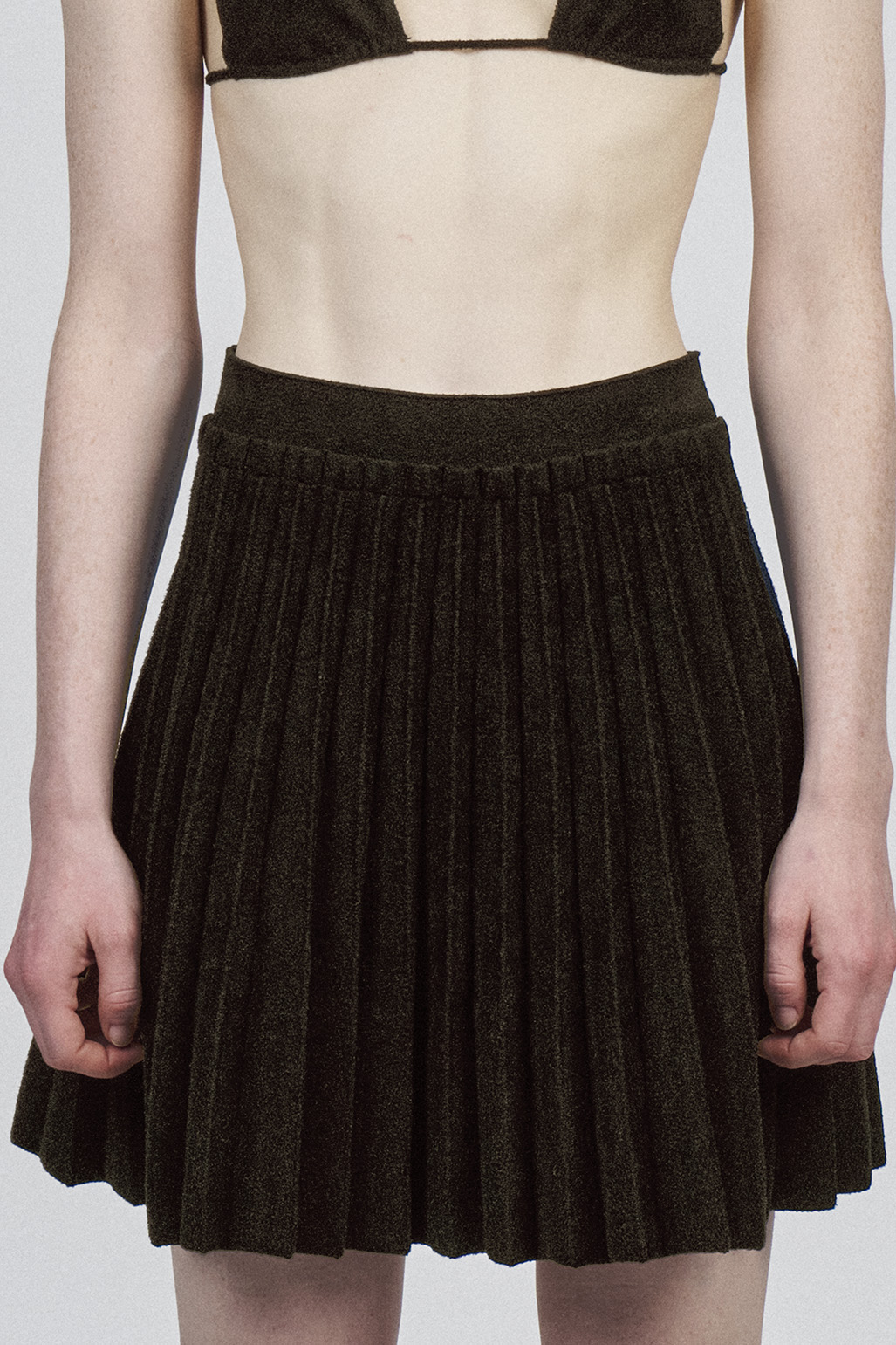 SOVEN knitted high waisted pleated skirt is crafted in Italy.