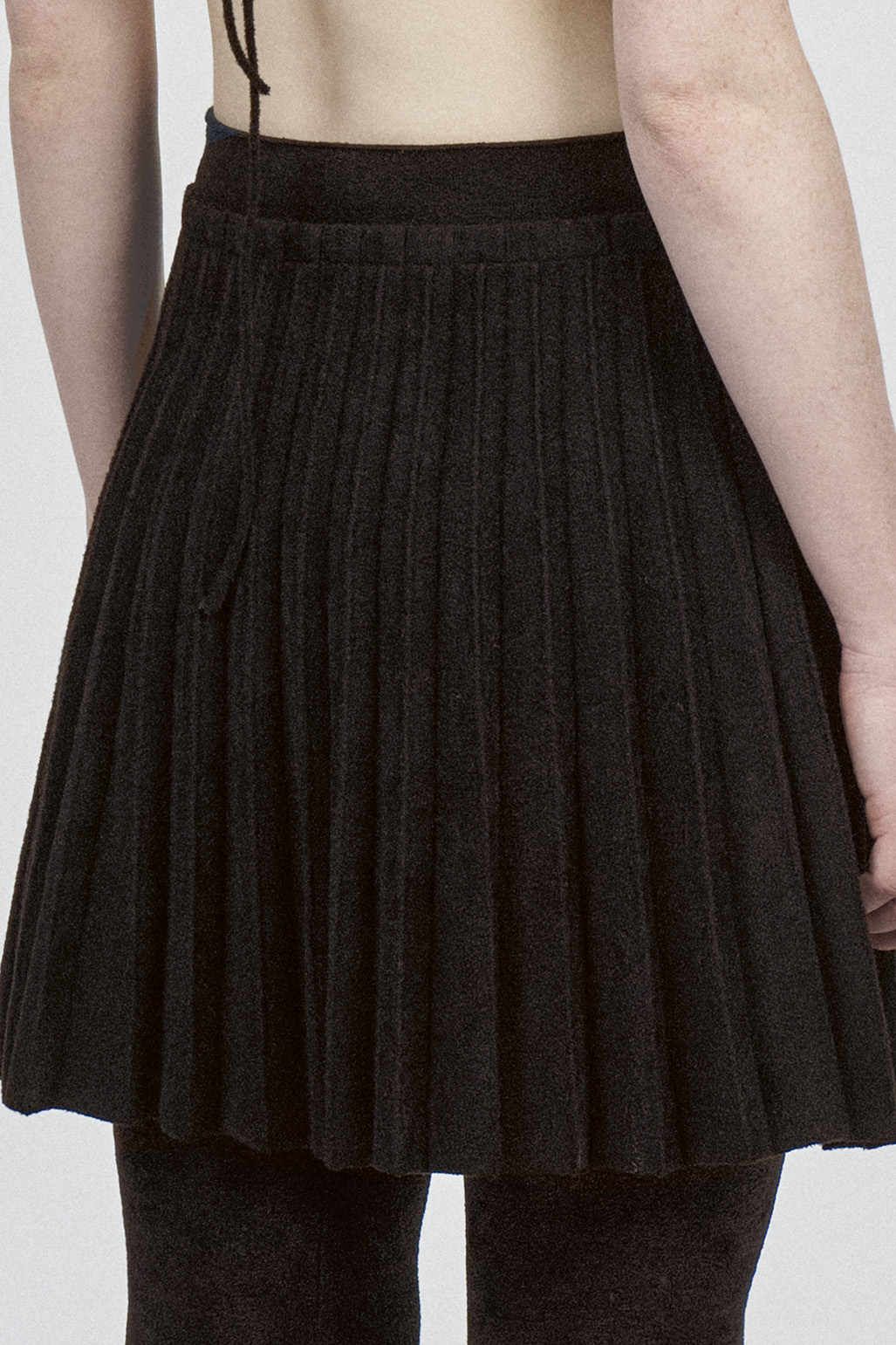 The skirt features a fastening design with an elasticated belt around the waist and an inside folding with the SOVEN knitted hybrid signature.