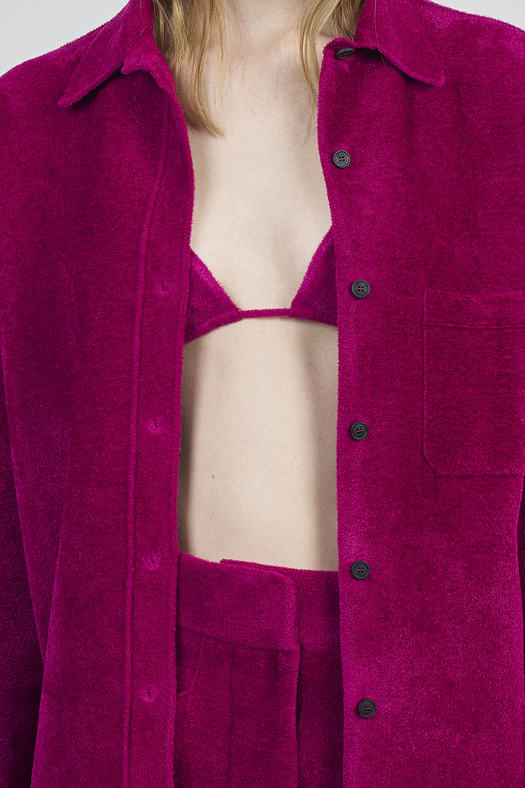 This chenille dropped shoulder SOVEN shirt jacket features a classic collar, cuffed pleated sleeves, front knitted buttonholes and signed buttons.