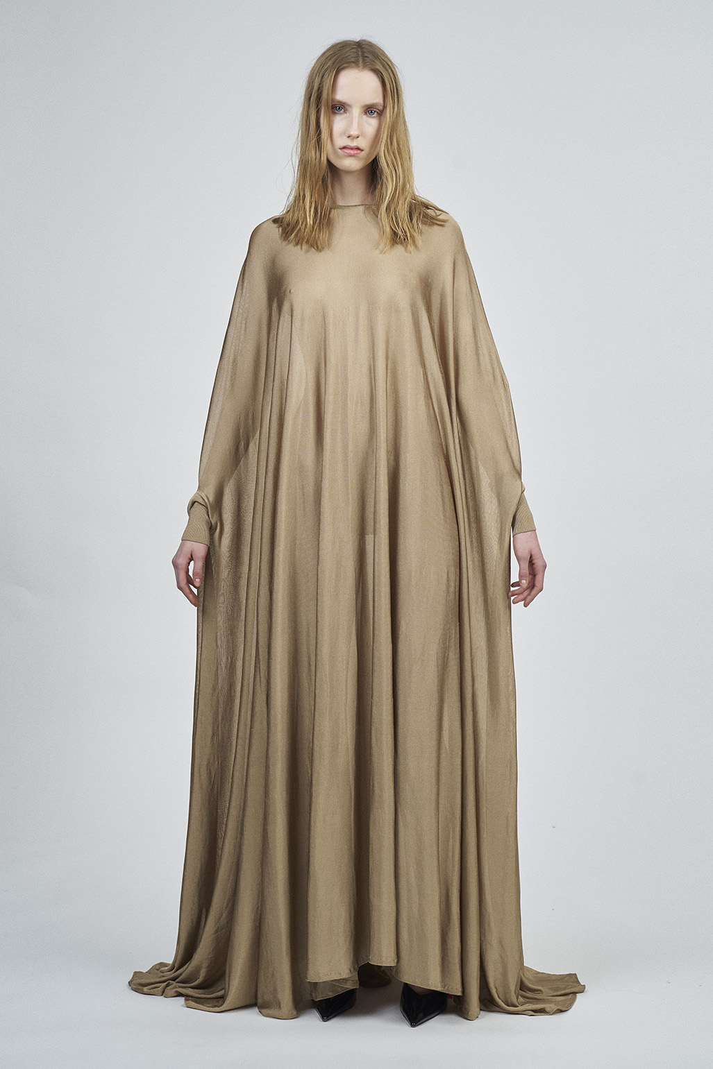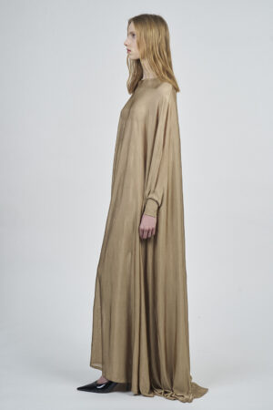 This Liquid long caftan SOVEN dress is spun to a wide and generous fit with bright and liquid viscose yarn and features a ribbed short cuff sleeves.