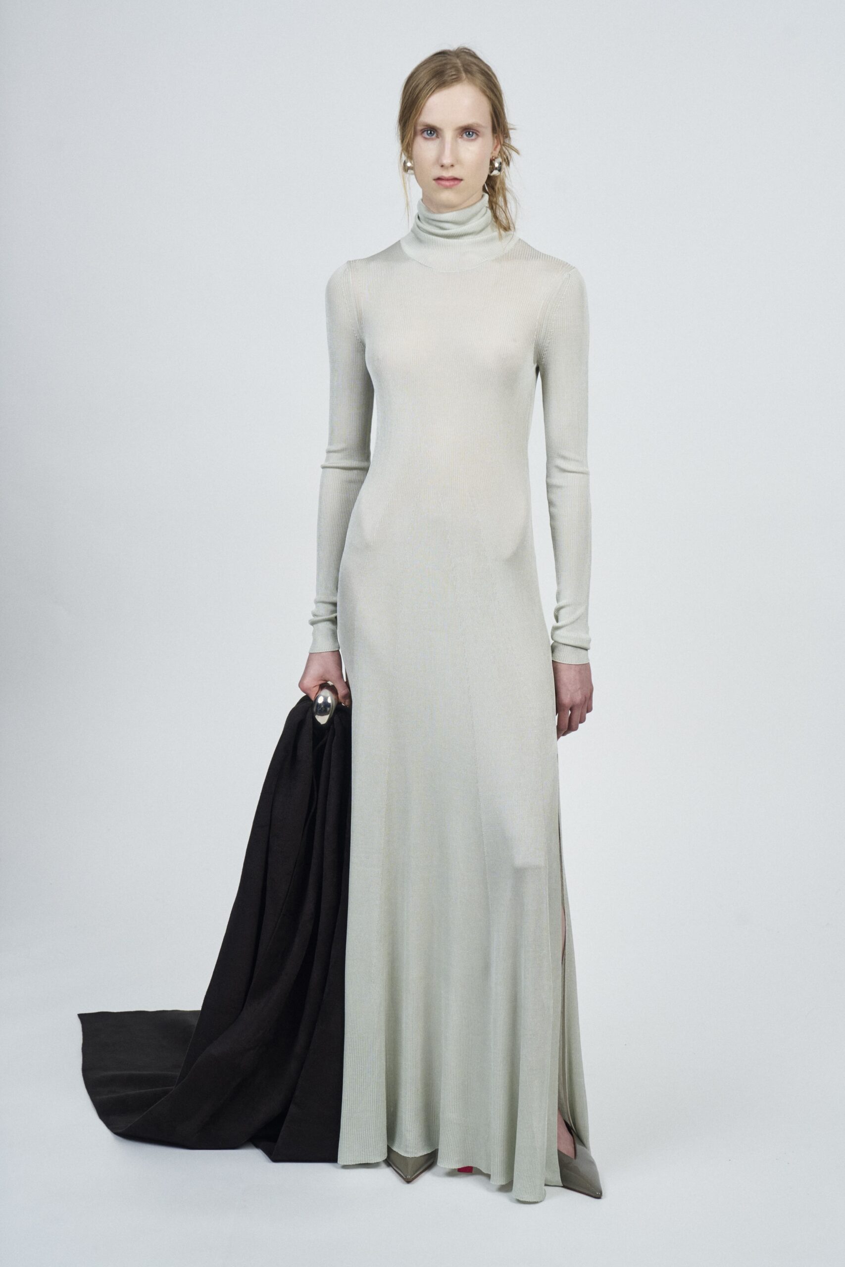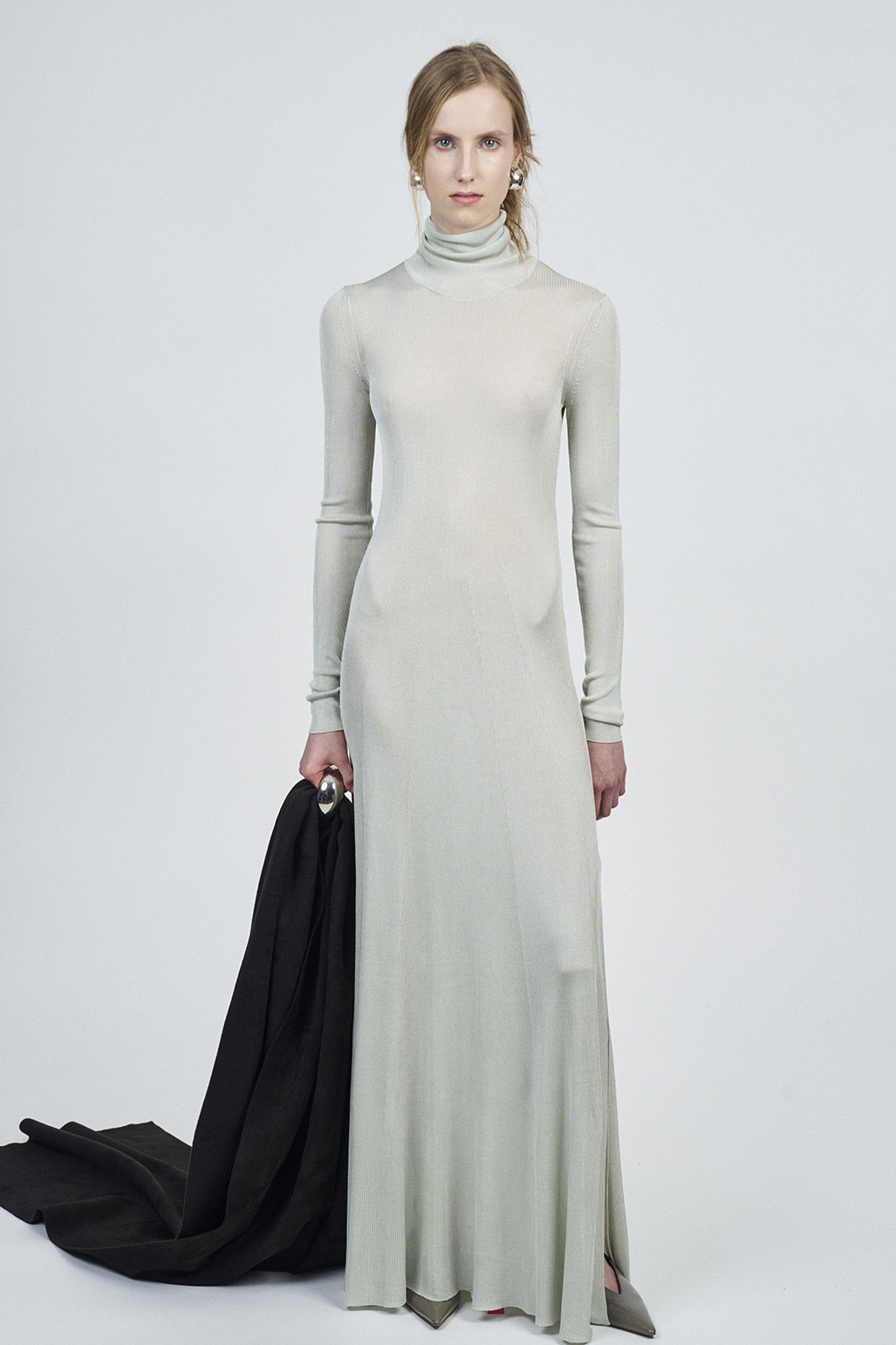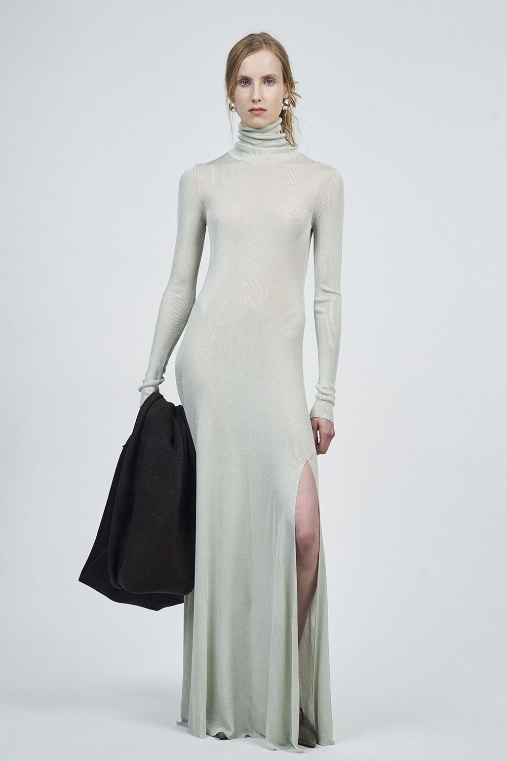 This liquid ribbed  slitted turtle neck SOVEN long dress is spun to a close fit with bright and soft viscose yarn and features a technical pleated finish, turtle neck and a long front-side slit.