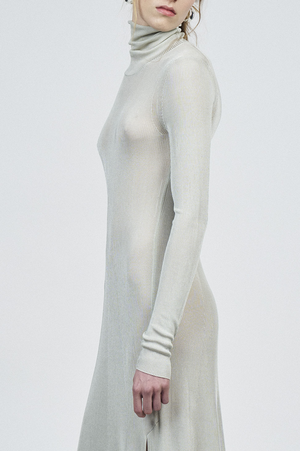 LIQUID RIBBED SLITTED TURTLE NECK LONG DRESS | ACQUA
